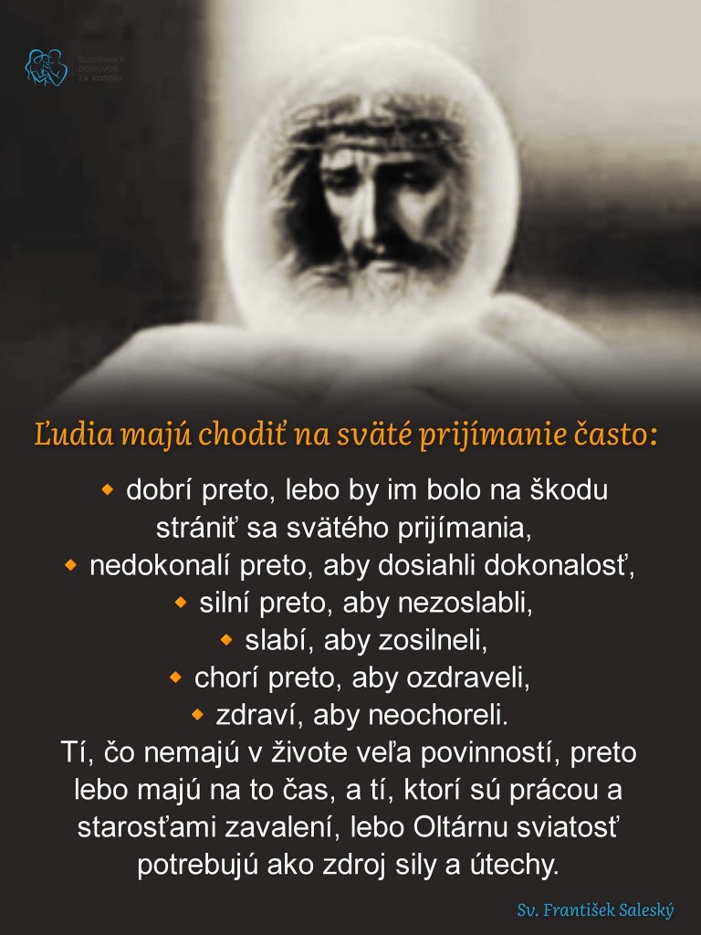 Prijímaj často! Lebo tak ako tvár Mojžiša od pohľadu na Pána Boha na hore Sinaj zažiarila zvláštnym jasom, tak sa aj tvoja duša častým požívaním Najsvätejšej oltárnej sviatosti – žriedla čistoty, krásy a svätosti – celkom premení a posvätí.
